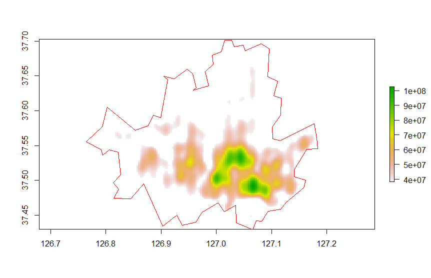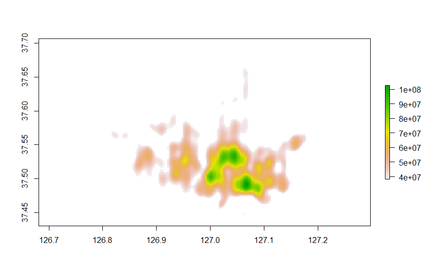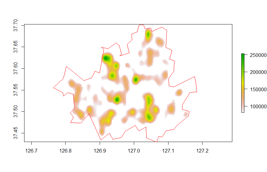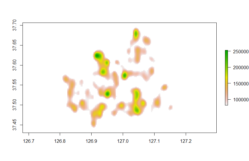 > d <- density.ppp(p, weights = kde_high$avg_price, # 커널 밀도 함수로 변환