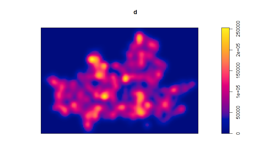 > d <- density.ppp(p, weights = kde_hot$diff, # 커널 밀도 함수로 변환