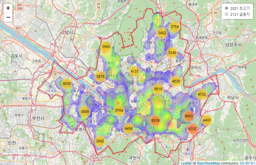+ addLayersControl(baseGroups = c("2021 최고가", "2121 급등지"),