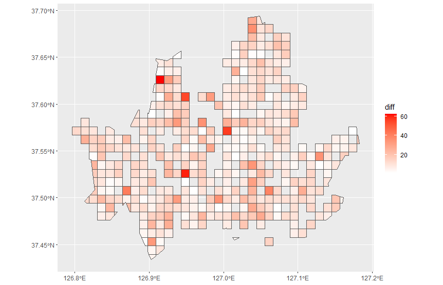 > kde_hot <- merge(grid, kde_diff, by = "ID") # 그리드에 상승 지역 결합