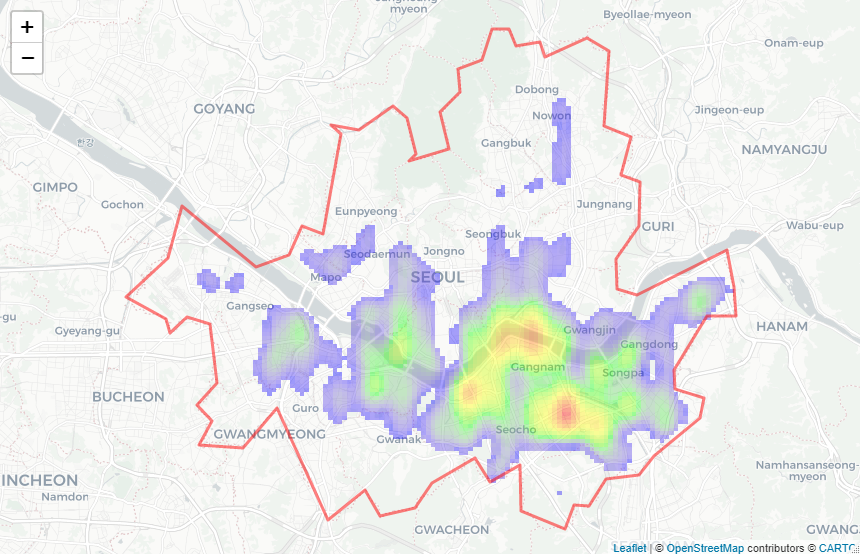 + lat = unlist(map(apt_price$geometry,2)), radius = 10, stroke = FALSE,