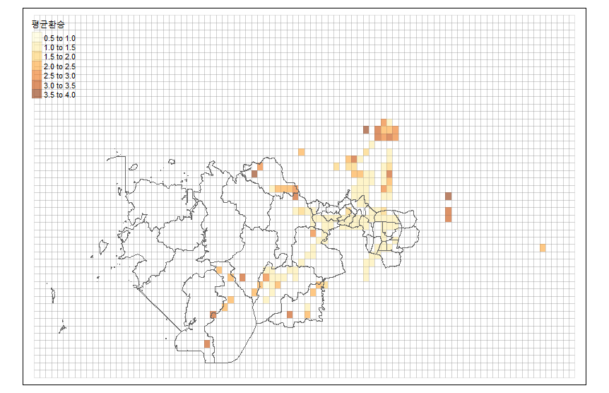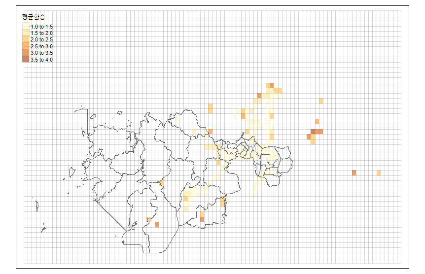 > grid_out$평균환승 <- round((grid_out$환승횟수 / grid_out$총이용객수), 1)