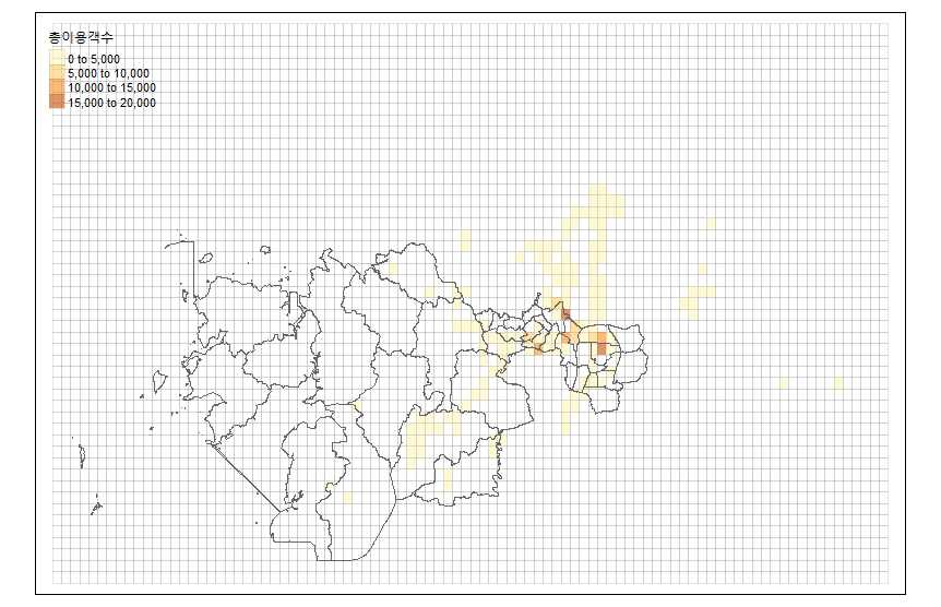 > # 총이용객수는 도심이 외곽 지역보다 많은 것으로 나타났다.