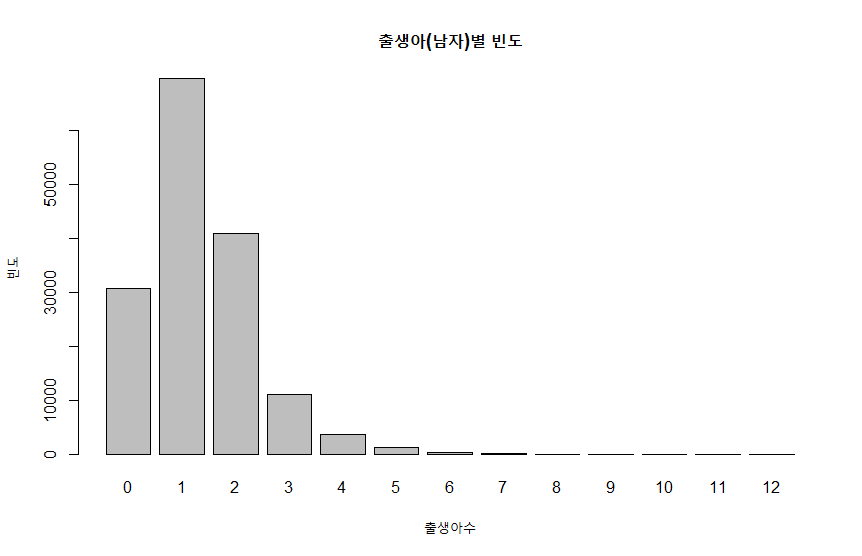 + main = "출생아(남자)별 빈도", xlab = "출생아수", ylab = "빈도")