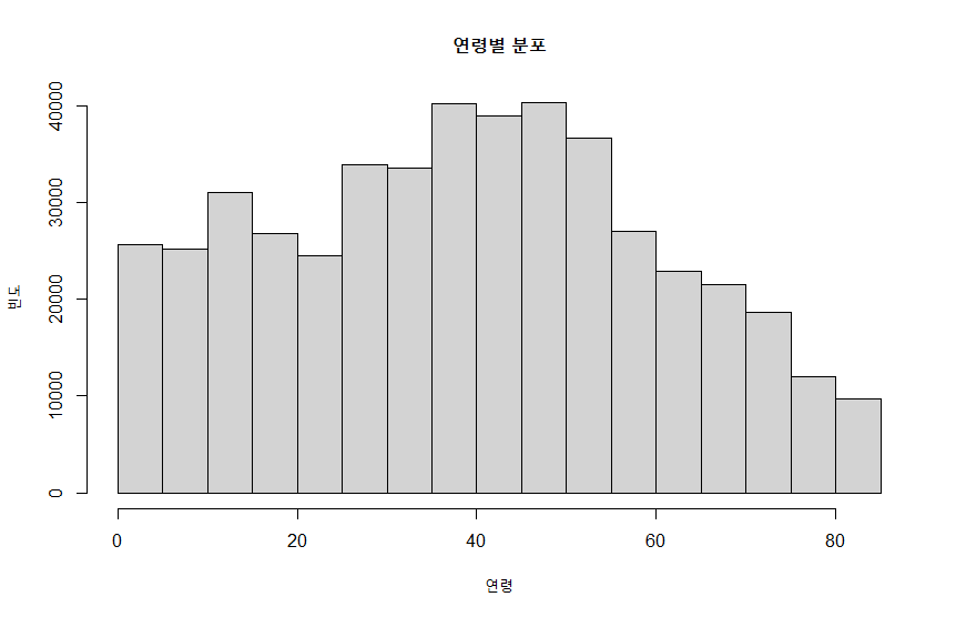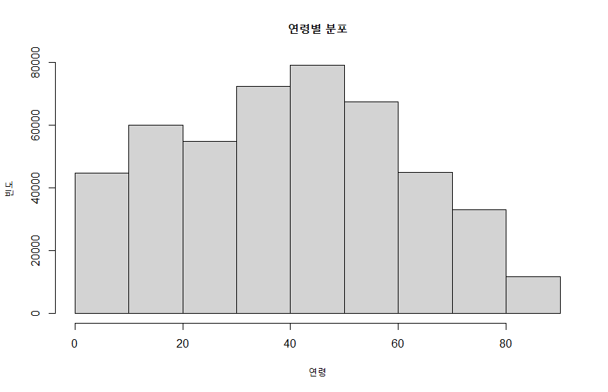 + main = "연령별 분포", xlab = "연령", ylab = "빈도")