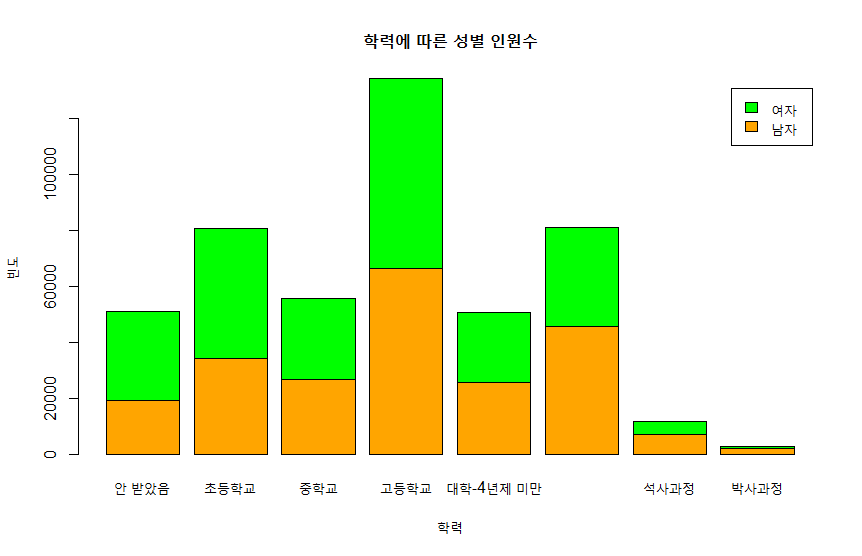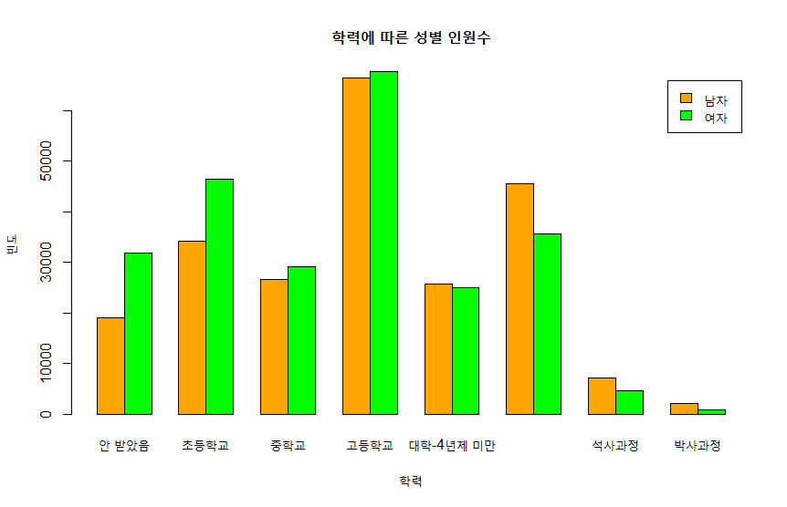 + main = "학력에 따른 성별 인원수", xlab = "학력", ylab = "빈도")