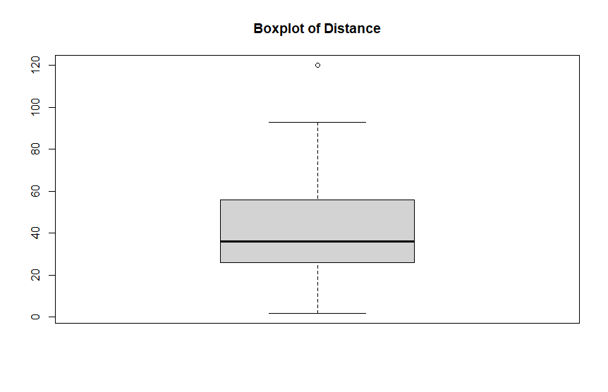 > boxplot(cars$dist, main = "Boxplot of Distance")