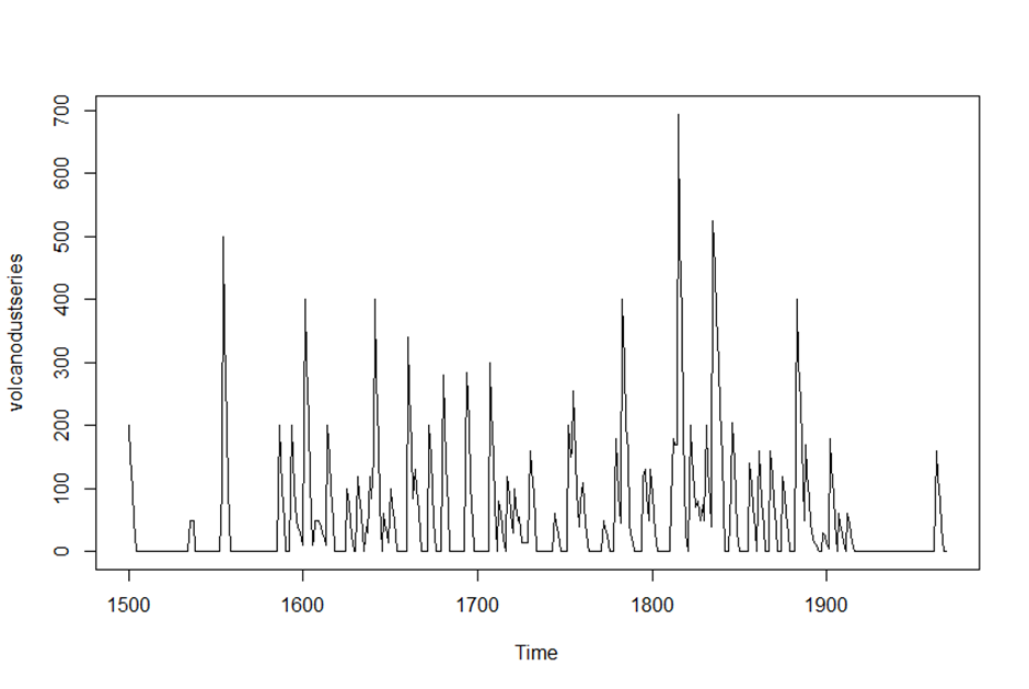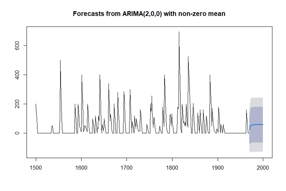 > volcanodustseriesarima <- arima(volcanodustseries, order = c(2,0,0))