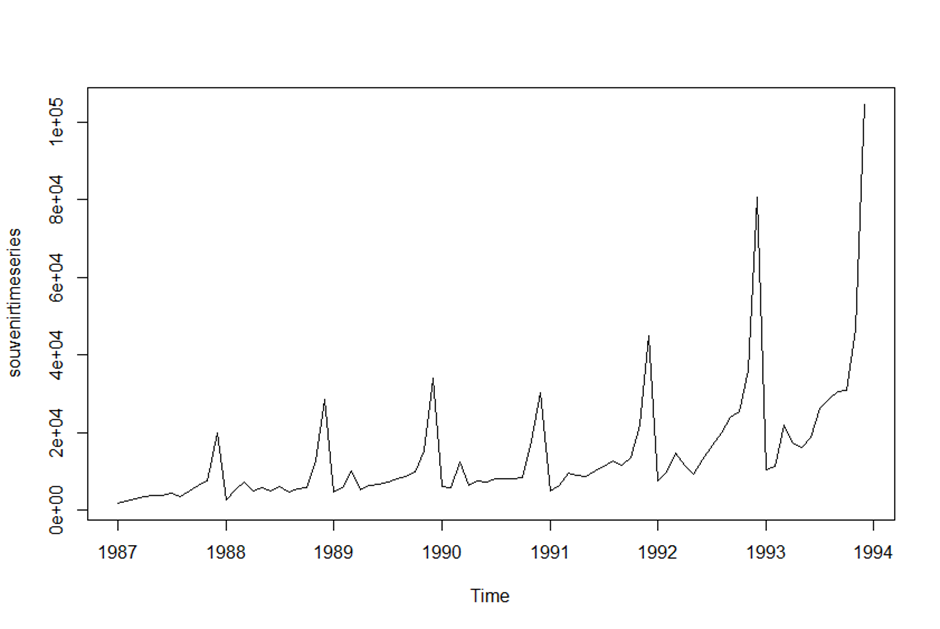 > souvenirtimeseries <- ts(souvenir, frequency = 12, start = c(1987,1))