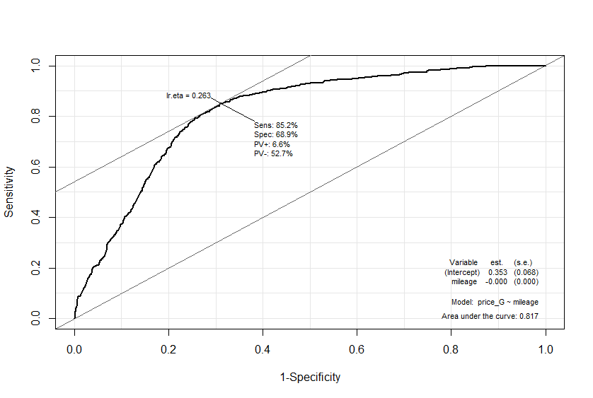> ROC(form = price_G ~ mileage, data = Test, plot="ROC")