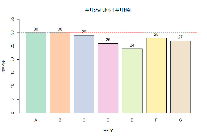 > # 막대그래프에 30기준으로 빨간색 점선 추가